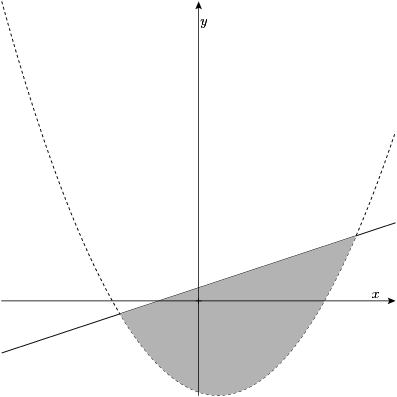 Last attempts:In the graph below, the straight line has equation $y=2x + 2$ and the curve has equation $y=2x^{2} -2x -14$. Find the value of the shaded area.